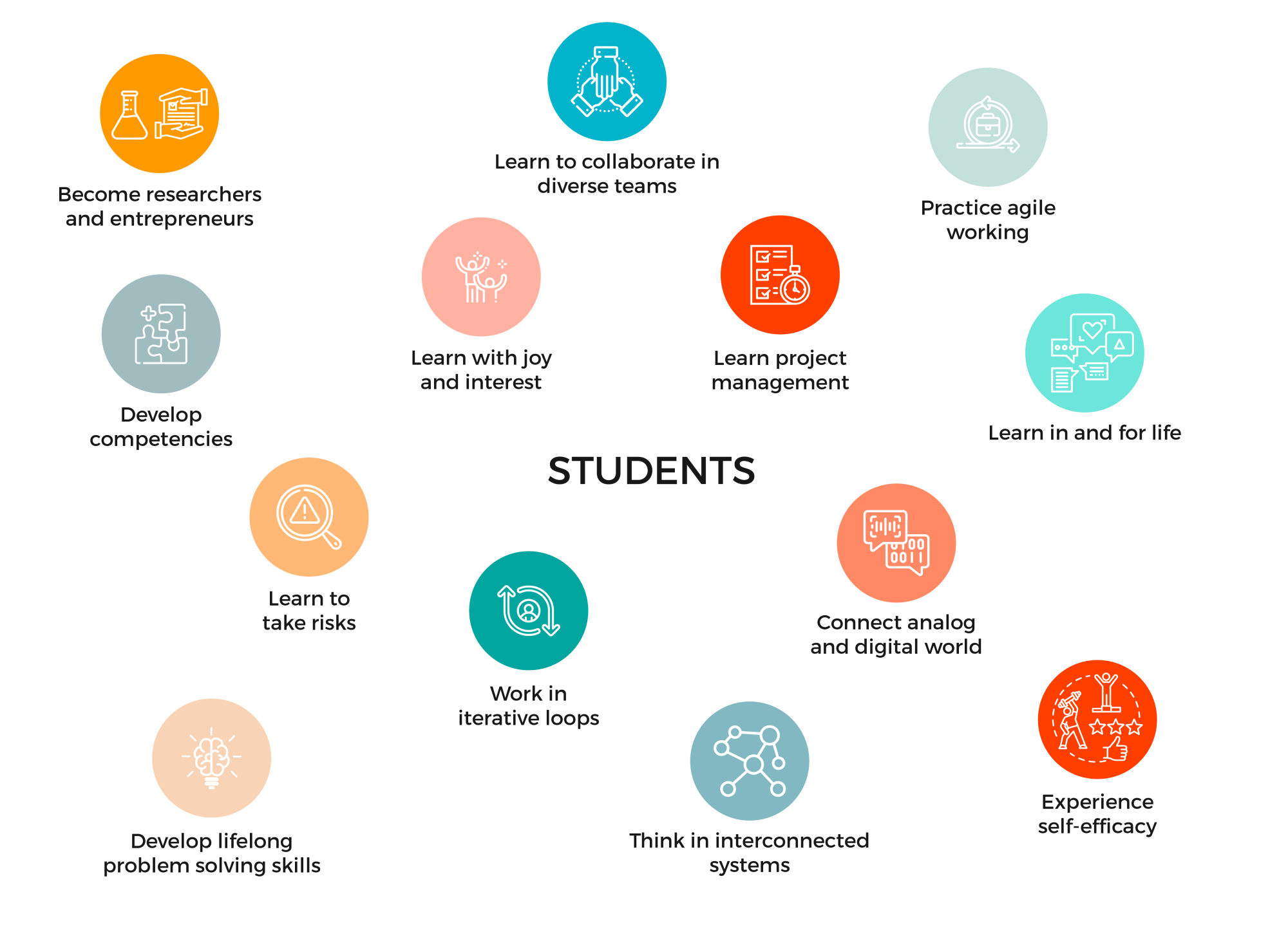 Subjects are not only taught in a fragmented way as independent islands of knowledge but rather are connected in relation to life. Essential skills, attitudes and knowledge of the 21st century are linked to relevant topics and problems from the students' lives. Learning is not a matter of memorizing facts and formulas but of holistic competence building.